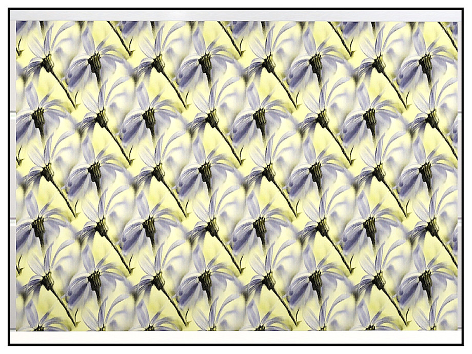 Fabric pattern: pale blue flowers on a yellow ground
