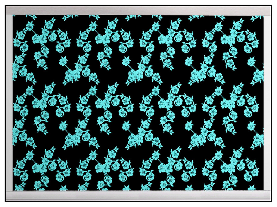 Fabric pattern: bright aqua blossoms on black.