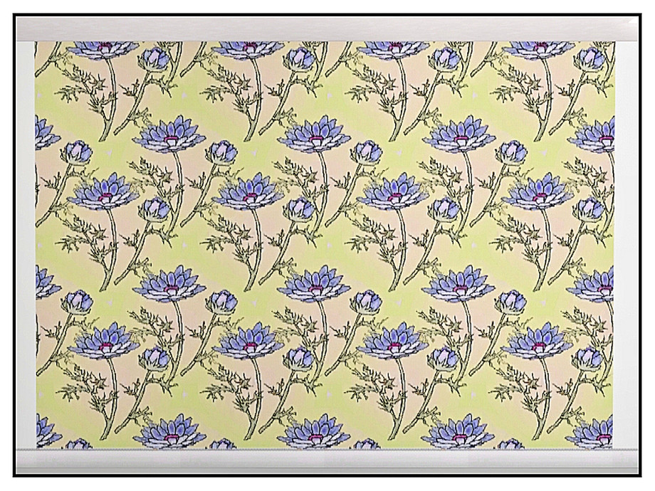 Fabric pattern blue ranuncluas on a pastel field.
