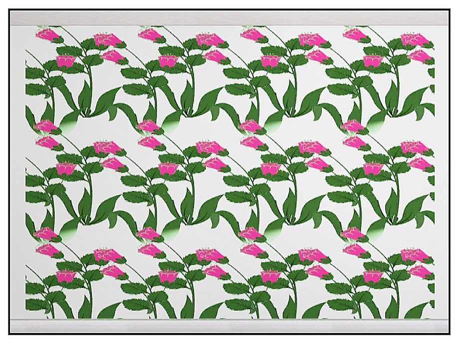 Fabric pattern: bright pink hibiscus buds and green foliage on white