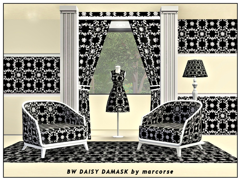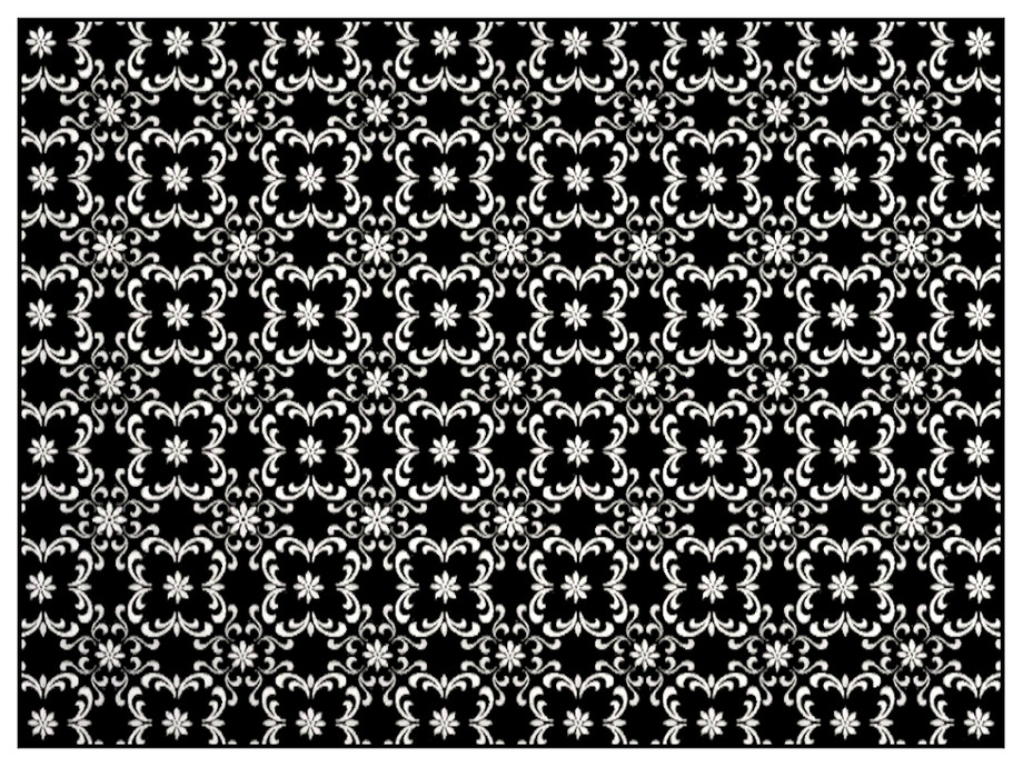 Fabric pattern: white damask-style motifs with daisy centres on black