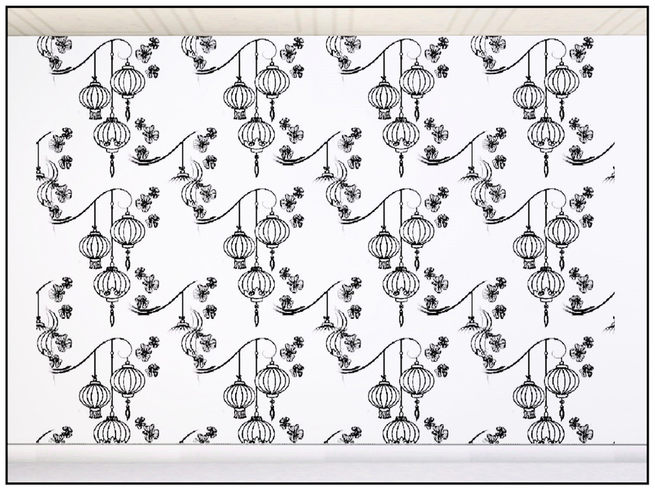 Fabric pattern: Chinese lanterns and floating flowers in black and white