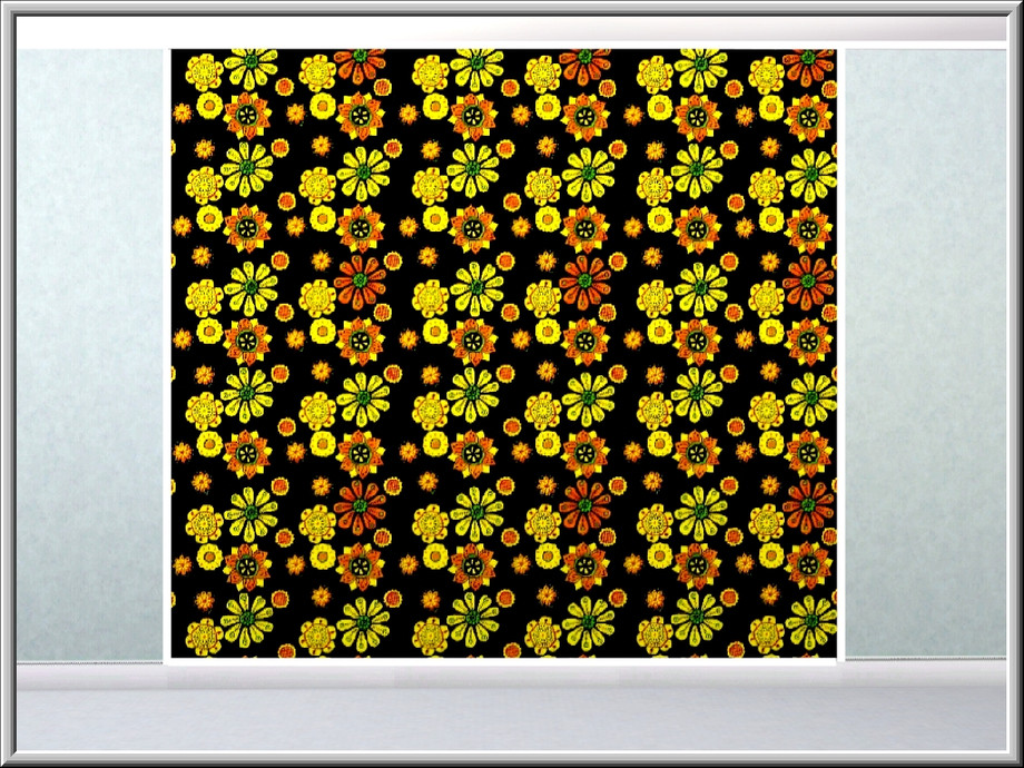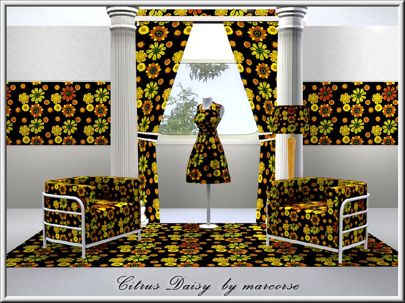 Fabric pattern: allover daisy design in citrus tones on black