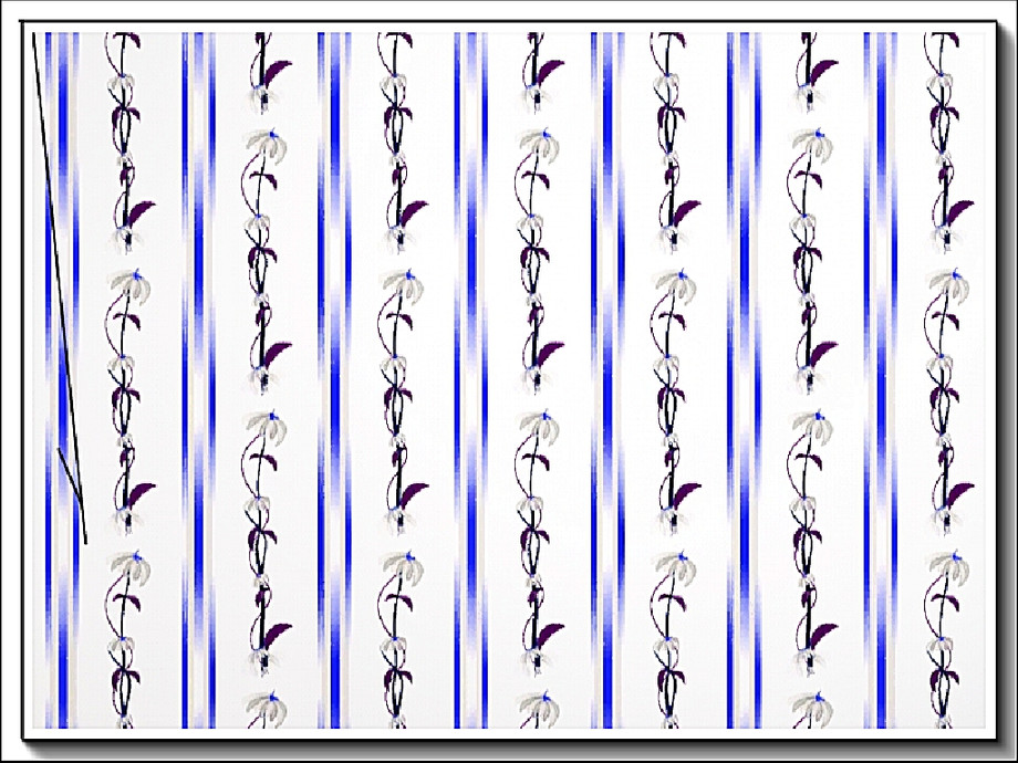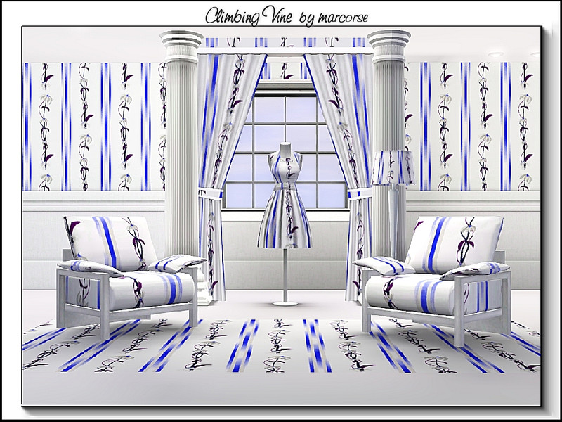 Fabric pattern - white flowered vine and blue vertical ribbon.