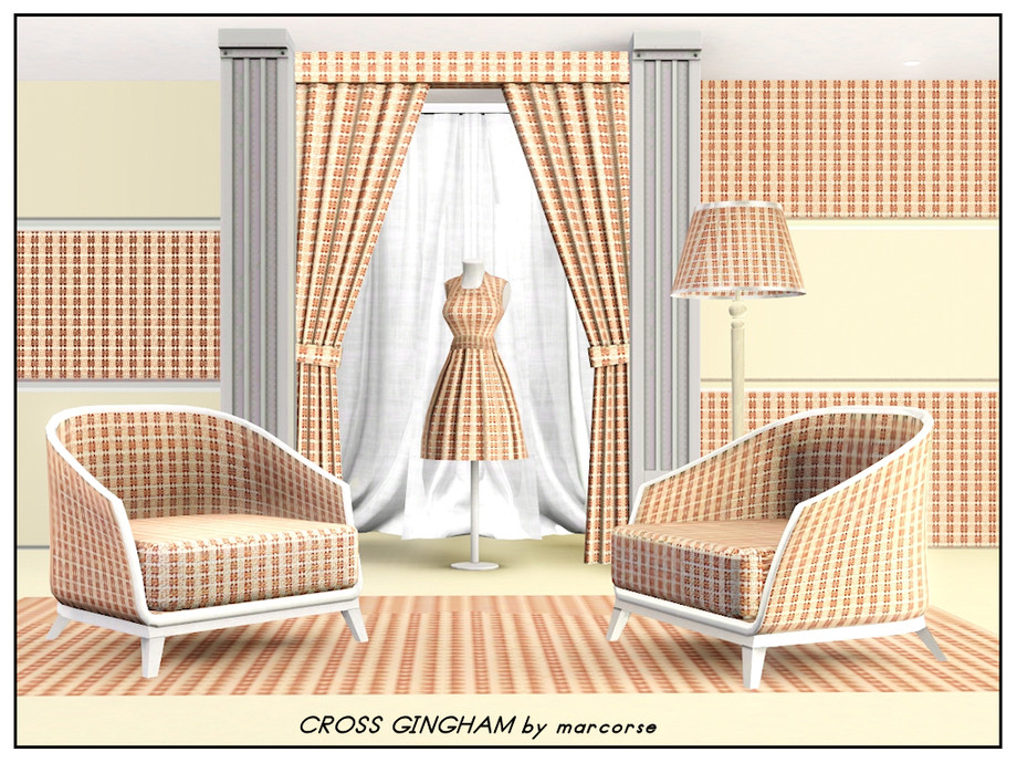 Fabric pattern: gingham style design with a brown cross on orange and cream