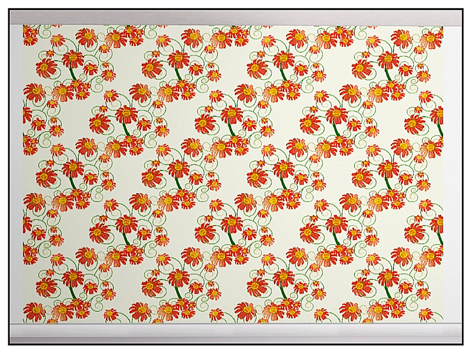 Fabric pattern: red and yellow daisy with reversed petals on cream