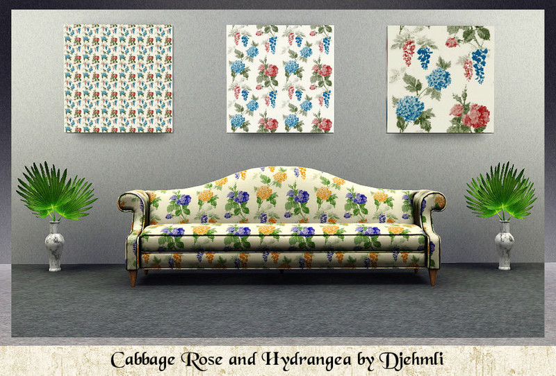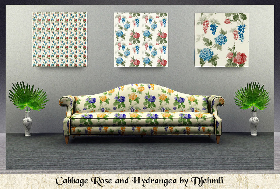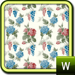 An all over pattern with Cabbage Rose, Hydrangea and Wisteria. Four Color-able palettes
