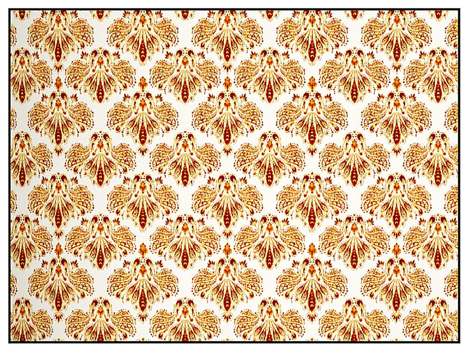 Fabric pattern: stylised butterflies in a Damask design in red/brown and yellow.