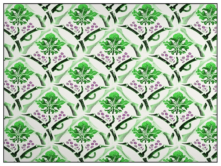 Fabric pattern: stylised grapes, leaves and branches in green and purple.