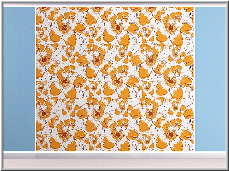 Fabric pattern: bright orange and white hibiscus flowers in a random repeat design.