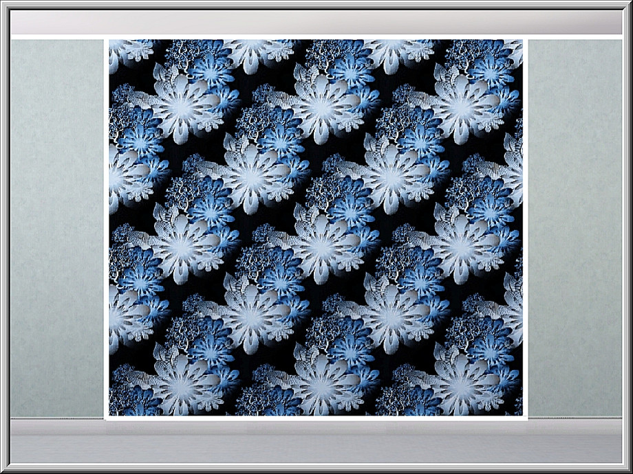 Fabric pattern: lacey blue and white flowers on black