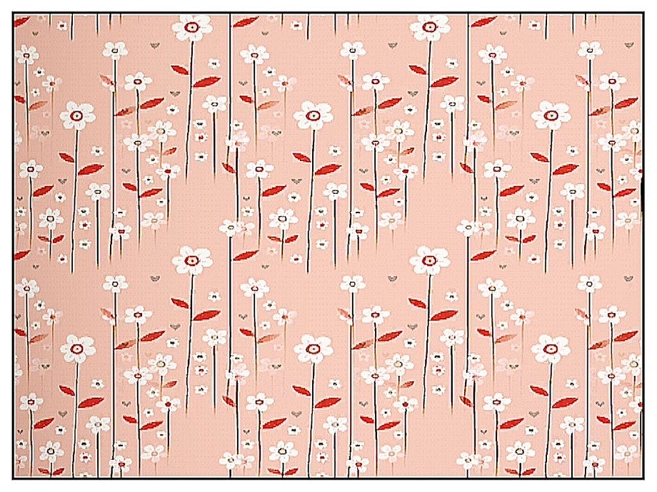 Fabric pattern: stylised white flowers on long stems in shades of red, pink and white