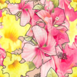Brightest of pink and yellow hibiscus flowers tumbling in a vertical, allover pattern.