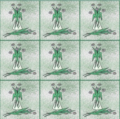 Arranging is a fabric pattern, which I have called a 'faux tile' because it is quite at home when used for that purpose. The design is a simple one of a half-completed floral arrangement - and the predominant colour is a cool green