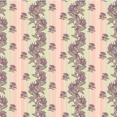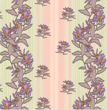 Stylised aster flower sprays, in two sizes in shades of pink and purple as a vertical pattern with an alternating striped band of pink and green.