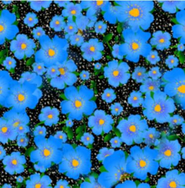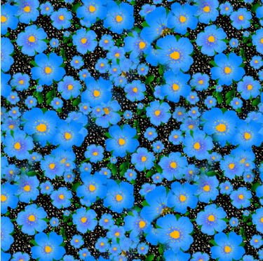 A random repeat pattern of bright blue flowers with yellow centres, against a dark, spotted 'snowstorm' background.