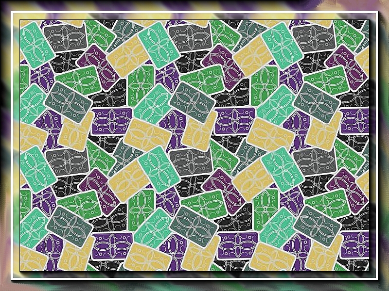 A fun design of playing cards, face down, in shades of yellow,green purple and black.