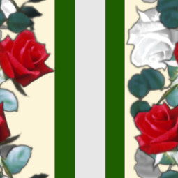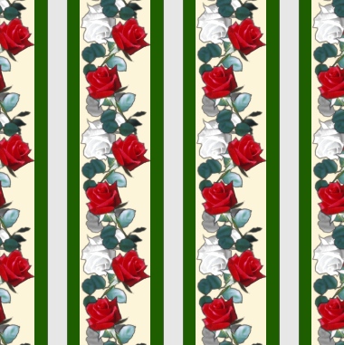 A vertical pattern in alternating stripes of plain green, and a mix of red and white roses.