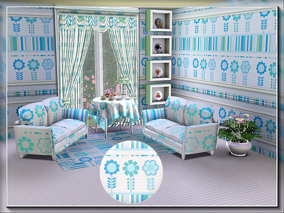 Daisy and Stripes was made for TSR with the Create a Pattern tool. Do not re-upload outside of TSR, nor claim it as your own work . . . .Credit for items in style shot: Sofa:BlackGarden. Curtain/lamp:jomsims. Tablecover:LilyoftheValley. Display case:Angela. Standing plates:Mutske. Table plates:Pilar. Table:DOT. Cakes:Pralinesims. Cups:deeiutza. Flowers:Apple. Plant:sim_man123.