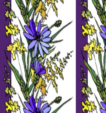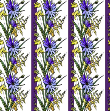 A star daisy in blue/purple shades with yellow accents alternating with a plain purple stripe make up this vertical pattern.