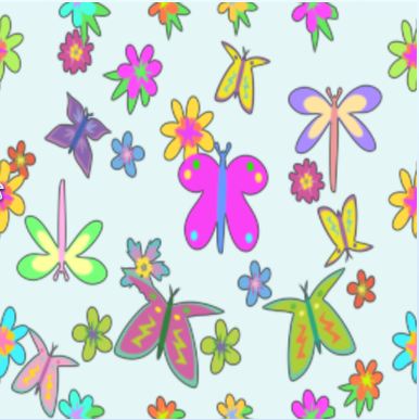 A sweet novelty pattern of daisies, butterflies and dragonflies - flowers and flying things - in bright colours.