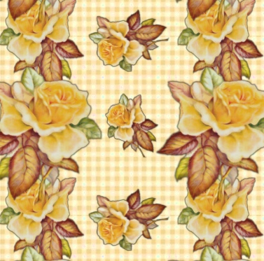 Soft gold roses against a gingham background form the basis of this pretty pattern with a country feel.