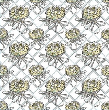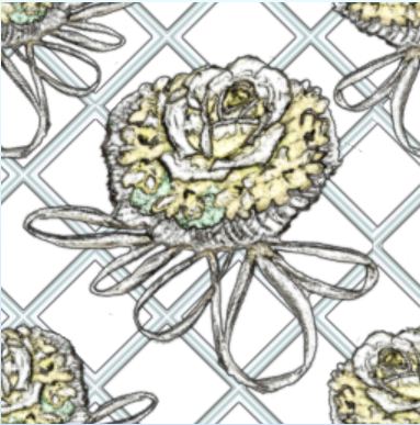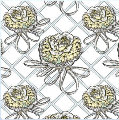 A pretty yellow and white, beribboned posy with a 'glassed' texture on a latticed background.