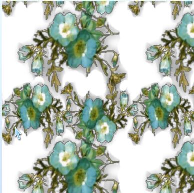 Green and white, open-faced flowers, buds and leaves in a design with both horizontal and vertical aspects.
