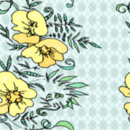 A simple vertical repeat pattern of mallow flowers and foliage, on a checkerboard backing.