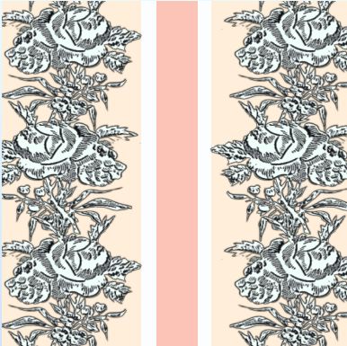 An oldfashioned parlour wallpaper design featuring a rose motif and contrasting vertical stripes.