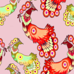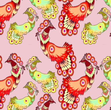 A bright pattern featuring stylised peacocks in cheerful shades of red and yellow.