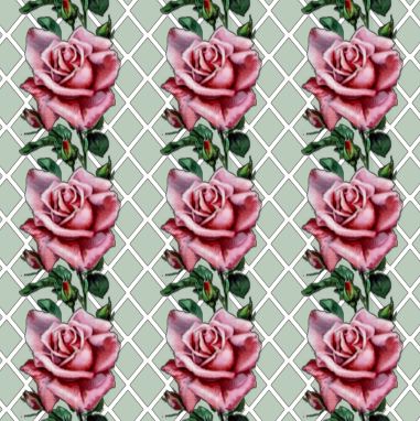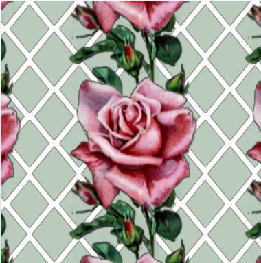 A spectacular pink rose, buds and leaves 'climb' this vertical repeat pattern with a lattice background.