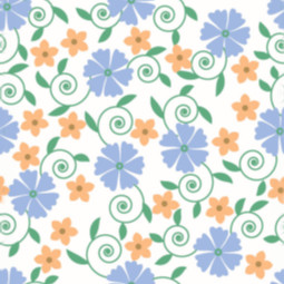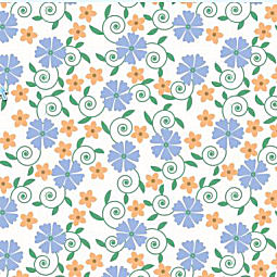 An allover, repeat pattern of small blue flowers, accented with smaller yellow ones, green leaves and pinwheel flourishes