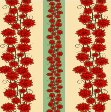 A simple, vertically striped repeat pattern of red flowers and tendrils on alternating bands of green and almost-yellow.