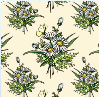 A bunch of white daisies and a yellow butterfly made up this repeat pattern - sometimes you see the butterfly, sometimes you don't.