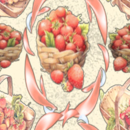 Baskets and punnets of ripe, red strawberries, in stripes separated by pink ribbon, create a delicious pattern.