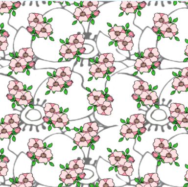 Pairs of pink briars in a scatter pattern on a background of the same image in an enlarged, monochrome version.