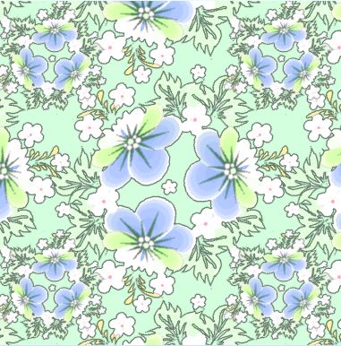 An allover repeat pattern of pansy wreaths in cool and refreshing shades of green and blue.