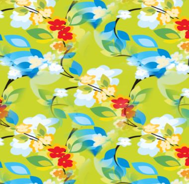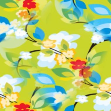 A splashy, flashy tropical design of flowers and foliage in red, blue and yellow, with a touch of white.