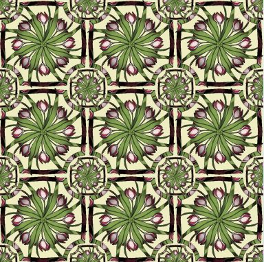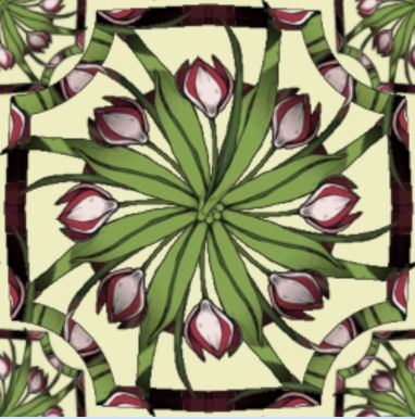 A bold shiedl shaped design of tulips and ribbons in purple and green - great for soft furnishings, but also at home as a tile.