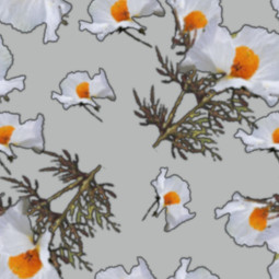A snowfall of white poppies in full bloom on a neutral background.