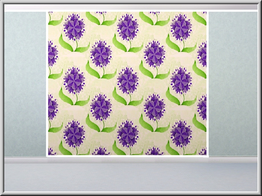 Fabric pattern: purple flower with multiple petal layers and green leaves.