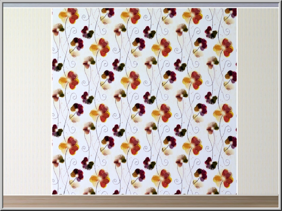 Fabric pattern: stylised pansies and curled stems in red and yellow