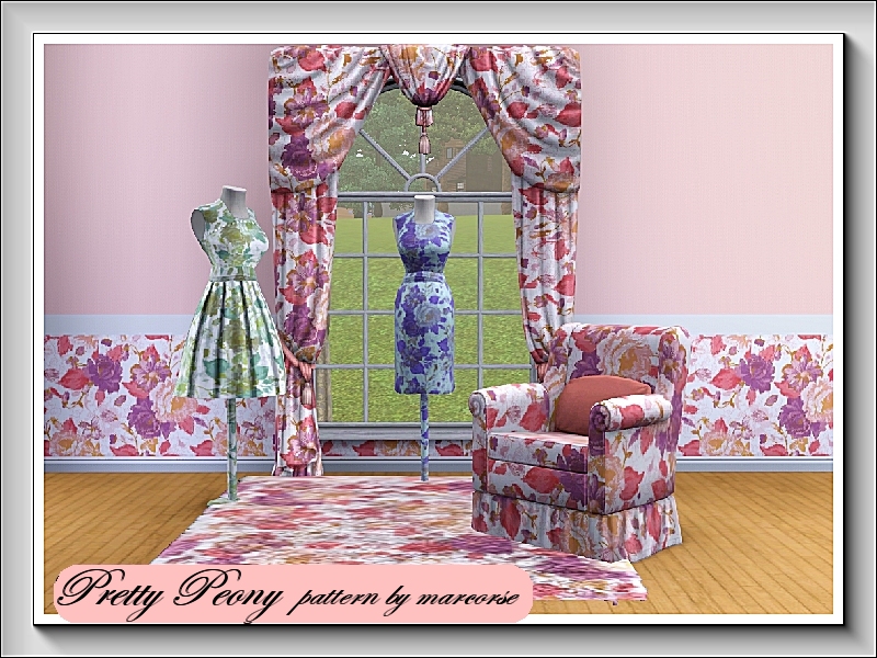Traditional wallpaper pattern featuring double and single peonies in pink/red tones. 3 palettes recolour. Found in Fabric.