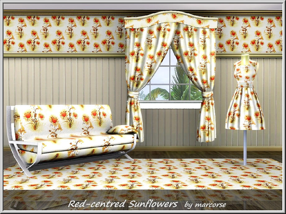 Fabric pattern: pretty little yellow sunflowers with red centres