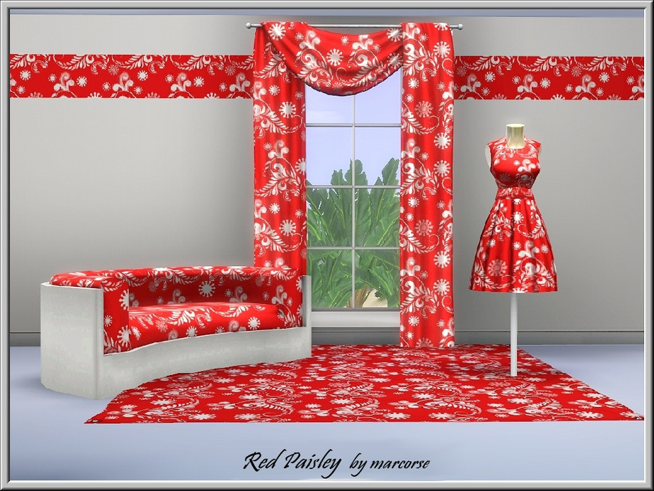 Fabric pattern: paisley leaf design, white on red.