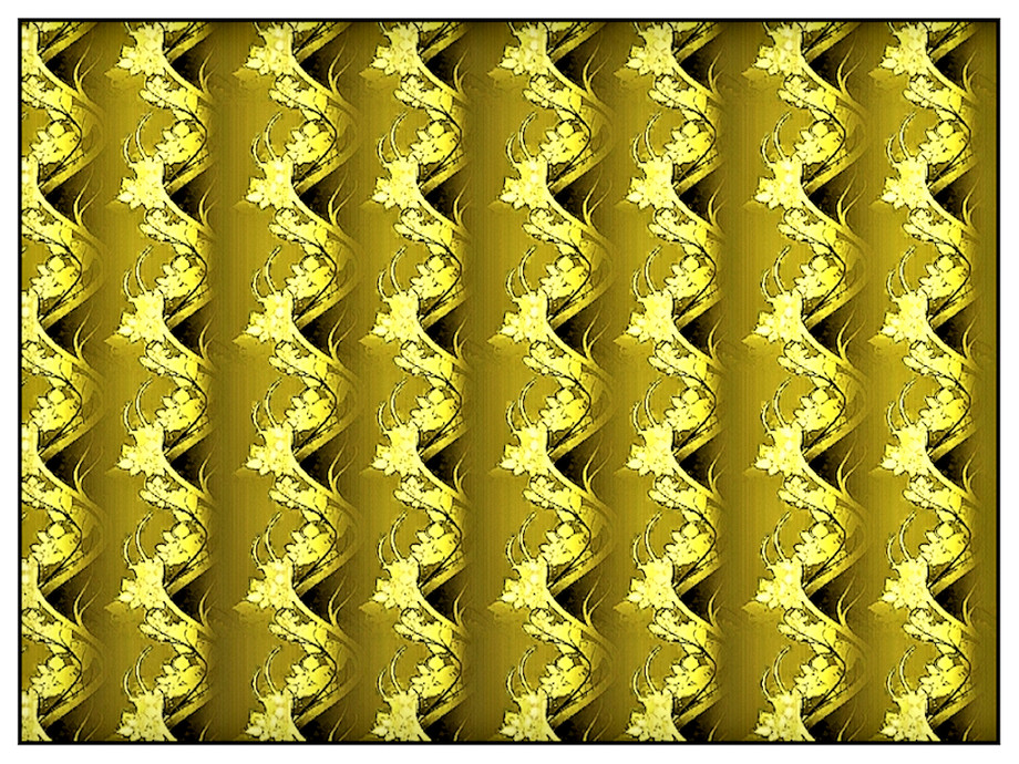 Fabric pattern: stylised yellow, brown and black tulip floral, in a vertical retro wallpaper design.