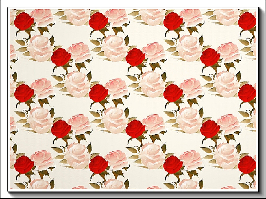 Fabric pattern: red and palest pink roses in a patchwork design.