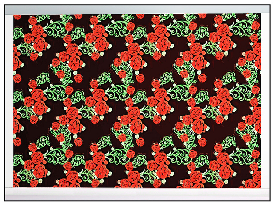 Fabric pattern: red roses and green scroll elements on black