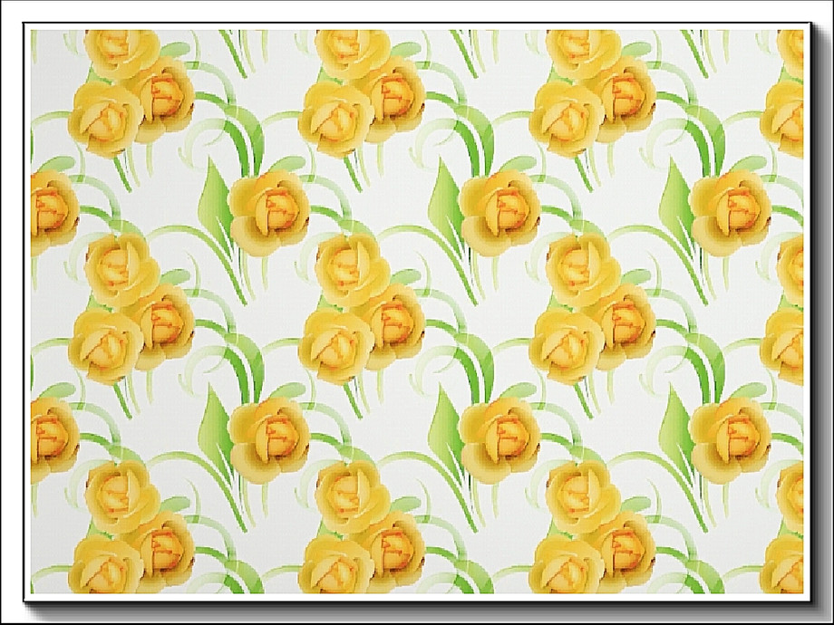 Fabric pattern amber roses and green leaves on white.